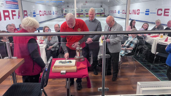 Mike Wilson cutting the celebratory cake with President Maureen Macleod, George Christie and Harold Haggart looking on.